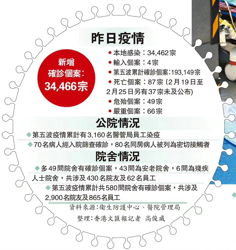 2月28日,香港新增确诊病例34462例,新增死亡病例87例。近一周内新增确诊病例超过10万例,第五波疫情爆发以来感染人数逐日升高,疫情拐点仍未出现。