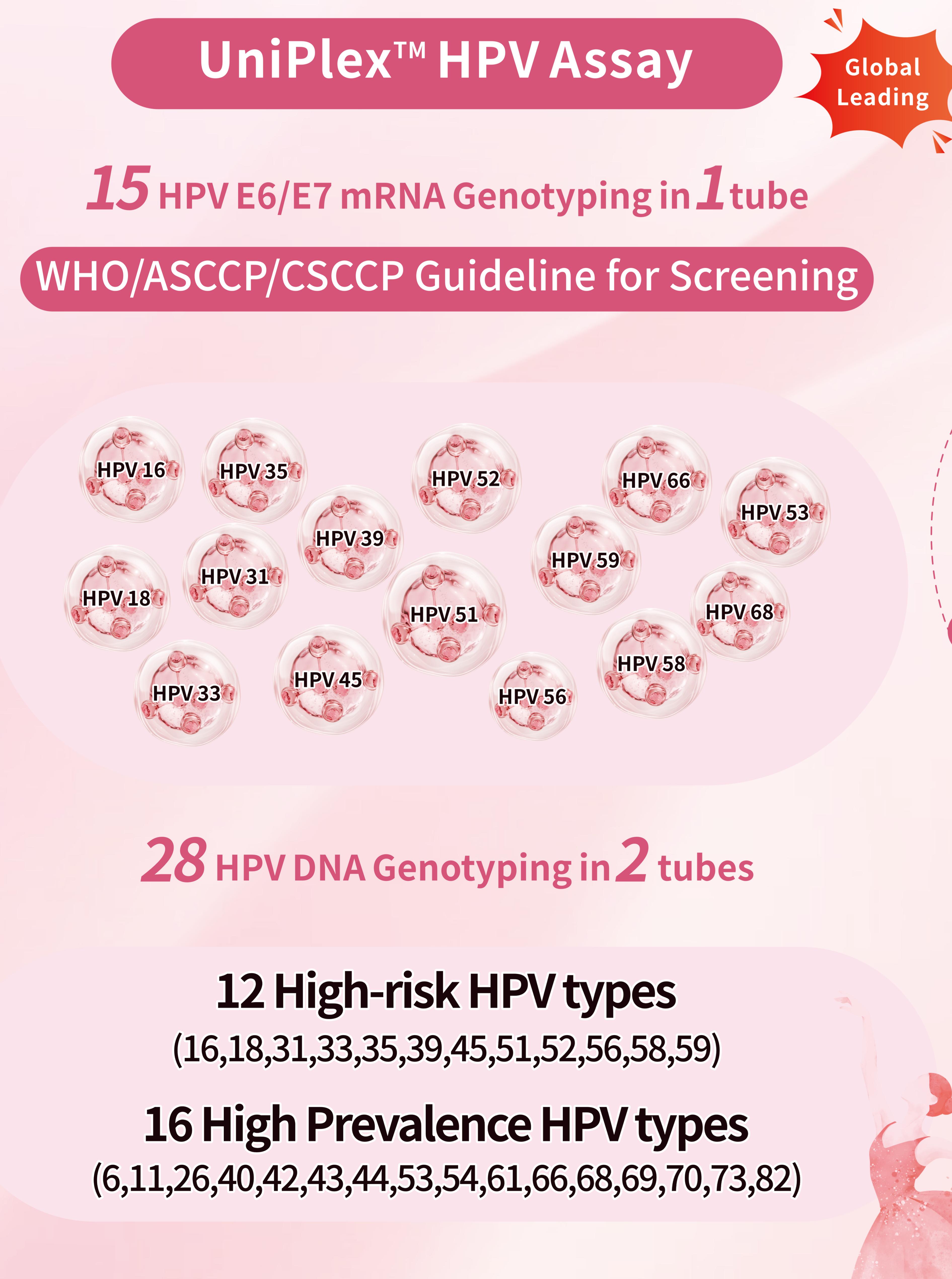 联合医学HPV E6/E7 mRNA基因分型检测试剂盒,采用荧光PCR溶解曲线法检测,可单管一次检测15种HPV E6/E7 mRNA,操作流程简单,技术平台成熟,结果准确性更高。同时展出的还有双管28种HPV DNA检测试剂盒等,检测内容包含12种高危型、16种高流行型别,共同助力HPV精准诊疗。