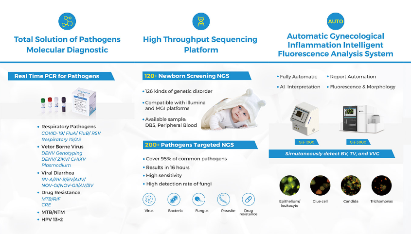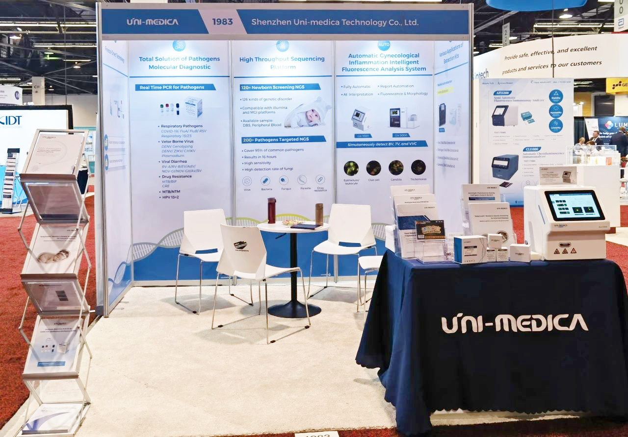 此次展会联合医学携荧光定量PCR全系列产品、妇科炎症智能荧光分析系统、tNGS病原体靶向测序等产品惊艳亮相会场。