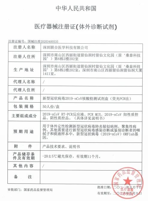 近日,联合医学新型冠状病毒(2019-nCoV)核酸检测试剂盒(荧光PCR法)已完成注册延续工作,试剂盒有效期在原有的6个月基础上延长至11个月,注册证有效期延长至5年。