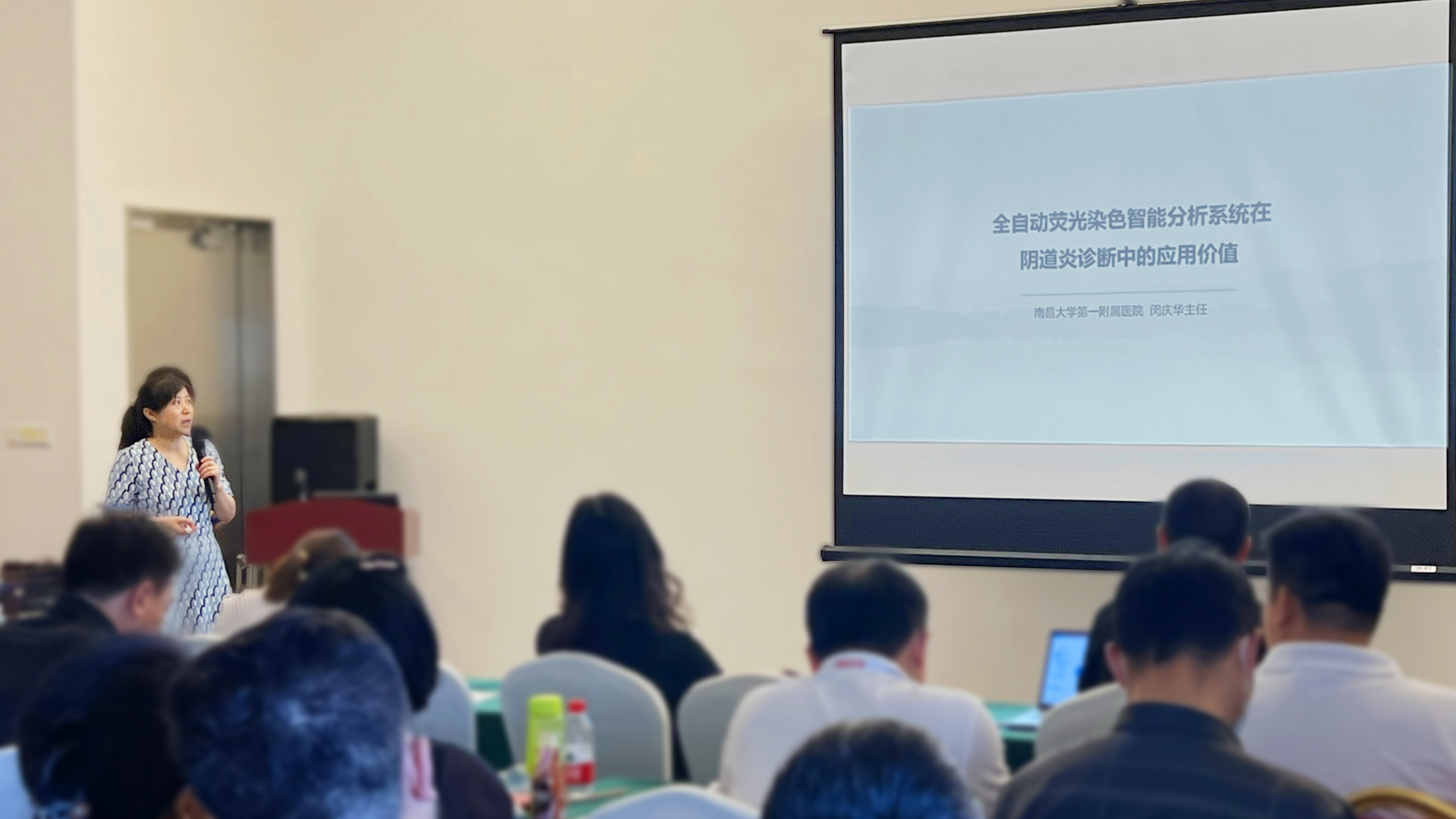 南昌大学第一附属医院妇产科主任闵庆华进行了《全自动荧光染色检测技术在妇科阴道炎中的应用》的主题分享