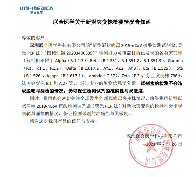 新型冠状病毒(2019-nCoV)为RNA病毒,相较于DNA病毒容易发生突变。新冠爆发至今全球范围内已发现多种突变株,包括Alpha(B.1.1.7),Beta(B.1.351、B.1.351.2、B.1.351.3),Gamma(P.1、P.1.1、P.1.2),Delta(B.1.617.2、AY.1、AY.2、AY.3),Eta(B.1.525),lota(B.1.526),Kappa(B.1.617.1),Lambda(C.37),Zeta(P.2),芬兰突变株796H,法国突变株B.1和A.27等。针对这些突变情况,联合医学高度重视,通过专业的生物信息学分析和实验验证,联合医学已获批上市的”新型冠状病毒2019-nCoV核酸检测试剂盒(荧光PCR法)“对于新冠病毒突变株的核酸检测不会造成脱靶与漏检的情况,可保证检测试剂的准确性与灵敏度。