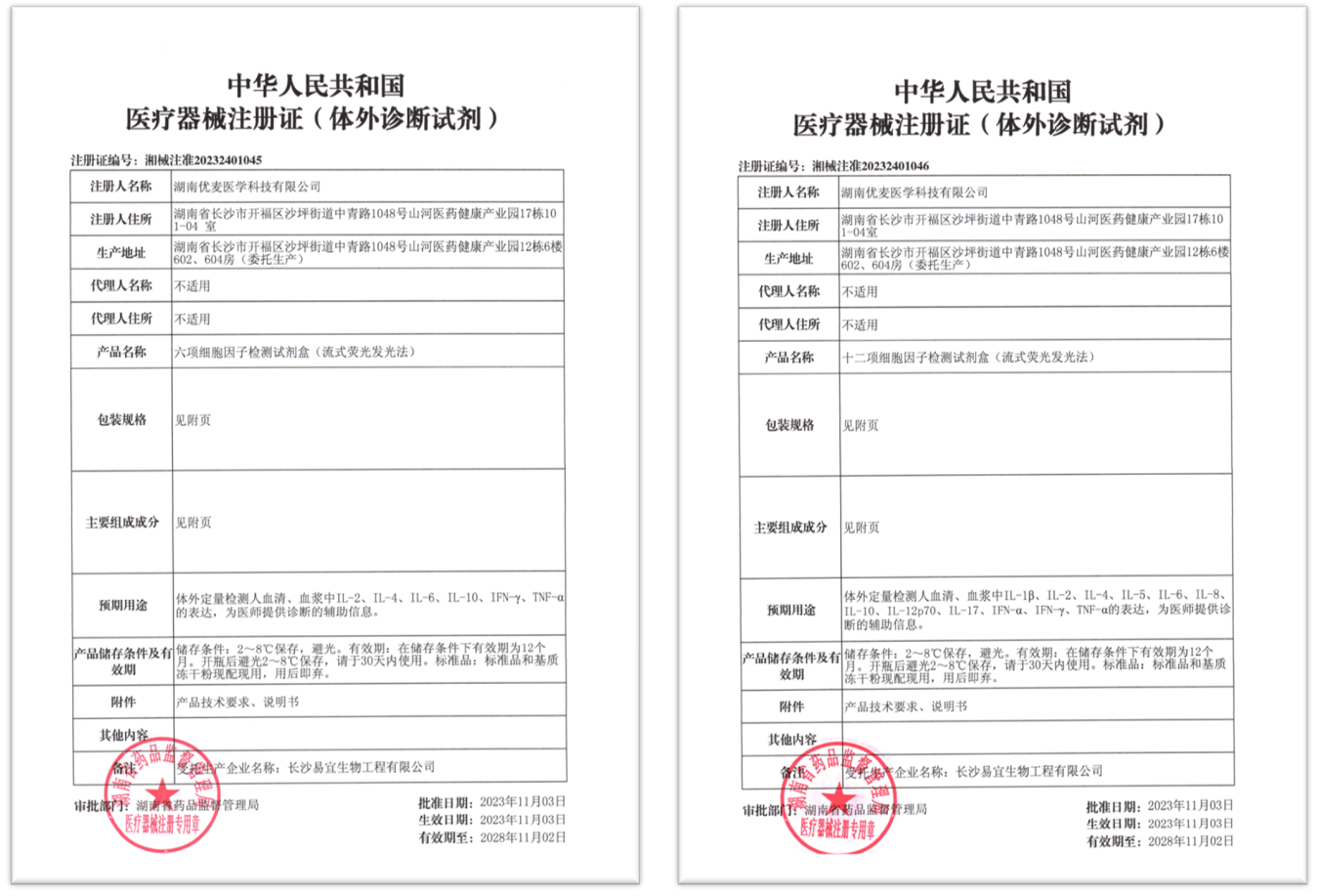 11月3日,湖南优麦医学(联合医学子公司)获得药监局颁发的“六项细胞因子检测试剂盒(流式荧光发光法)”、“十二项细胞因子检测试剂盒(流式荧光发光法)”医疗器械二类注册证,这标志着联合医学在流式多项细胞因子检测领域又迈出了坚实的一步。