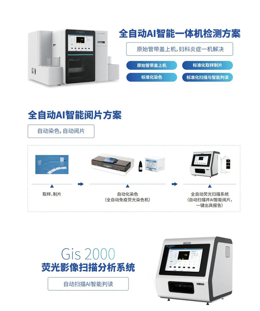 联合医学免疫荧光全景解决方案不仅包含免疫荧光扫描影像分析系统,可实现妇科炎症的自动扫描与智能判读。还包含全自动免疫荧光扫描分析一体机,高度集成一体机设计,原始管上机,一键出报告,无需任何人工干预,高度智能化。多种解决方案可灵活满足临床的多种需求,实现妇科炎症的快速检测。