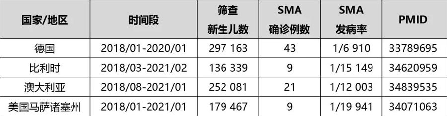2021年,有来自4个国家/地区的研究人员报道了他们的新生儿SMA筛查的阶段性结果,包括德国、比利时、澳大利亚和美国马萨诸塞州。SMA发病率从1/19 941至1/6 910不等。在这些研究中,仅有1例患者因SMN1基因外显子7杂合缺失合并点突变而漏检,表明新生儿SMA筛查是可行的,可以在人群基础上实施。
