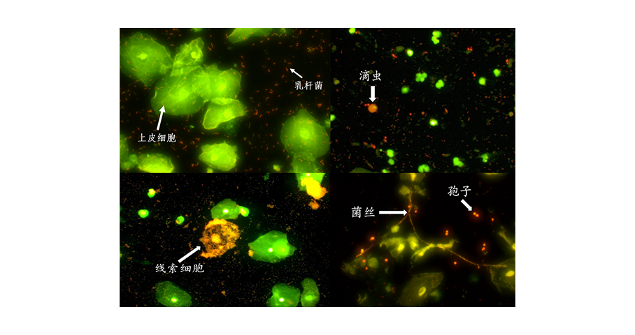 本染色液为多种免疫荧光染料的混合液,可在同样的染色条件下,同时对上皮细胞、白细胞、乳杆菌、加德纳菌、真菌、阴道毛滴虫进行免疫荧光标记染色,使其各自在同一光源下呈现不同的染色效果,最终实现在同一光源、同一视野下易于区分的目的。